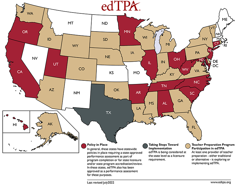 Policy in Place. In general, these states have statewide policies in place requiring a state-approved performance assessment as part of program completion or for state licensure and/or state program accreditation/review. In these states, edTPA also has been approved as a performance assessment for these purposes. States with a policy in place are colored red, and include: